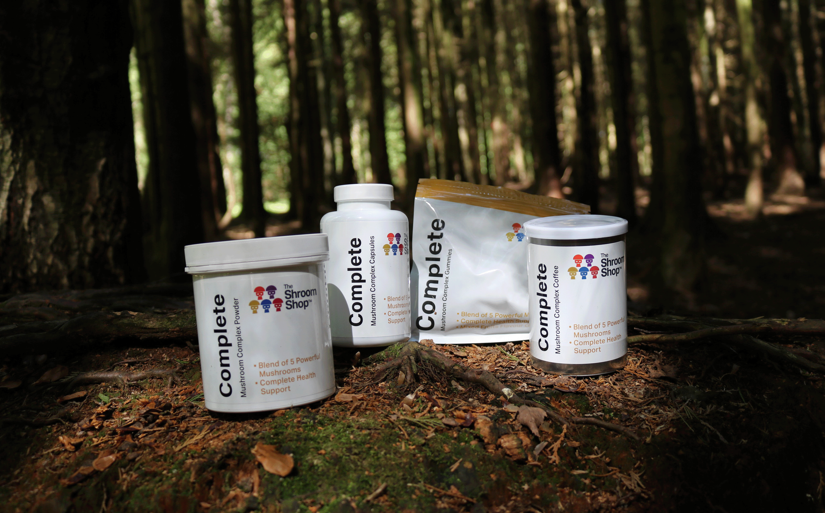 The ultimate blend of five functional mushrooms. Available as Capsules, Powder, Coffee, or Gummies.